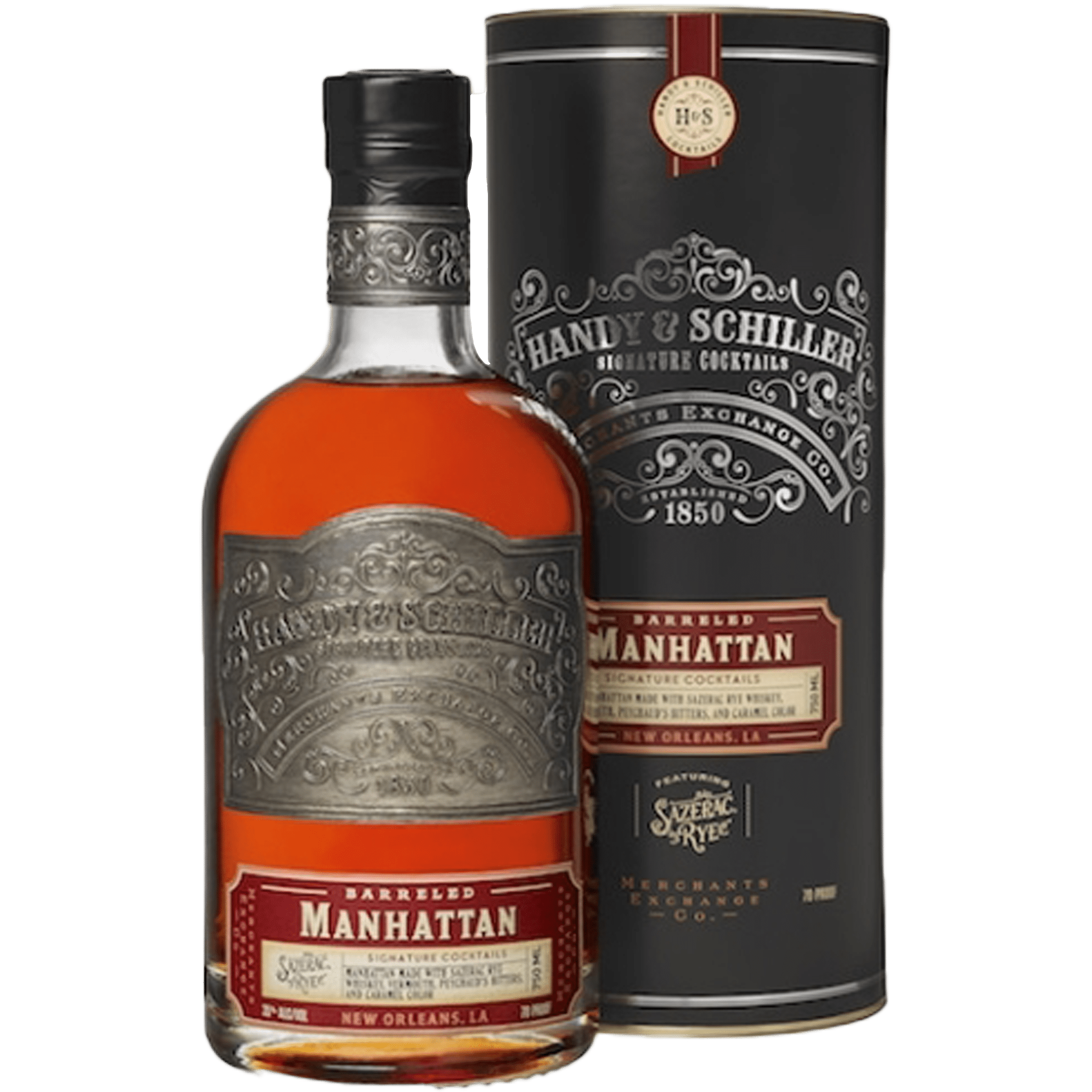 Handy & Schiller Manhattan, 70 proof, is also made using Sazerac Rye Whiskey, vermouth and Peychaud’s Bitters, and is aged in Sazerac Rye barrels.