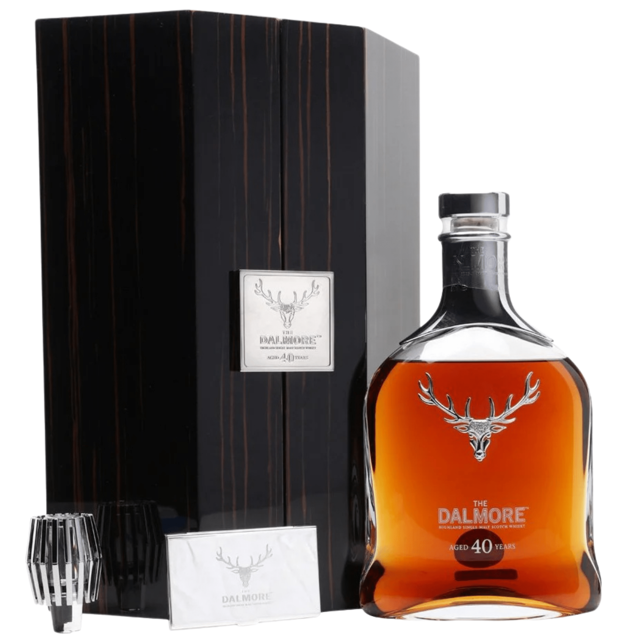 A: The decanter is handcrafted crystal, featuring The Dalmore’s signature silver stag emblem.