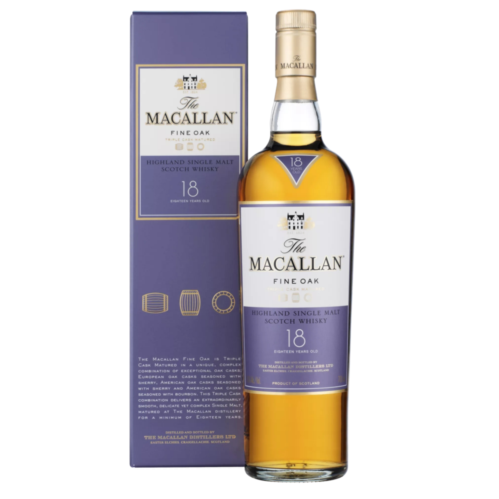 The Macallan Fine Oak 18 Years Old 750ML is a beautifully balanced single malt Scotch whisky from the world-renowned Macallan Distillery. This exquisite spirit is triple cask matured in a unique combination of European sherry-seasoned oak, American sherry-seasoned oak, and ex-bourbon American oak.