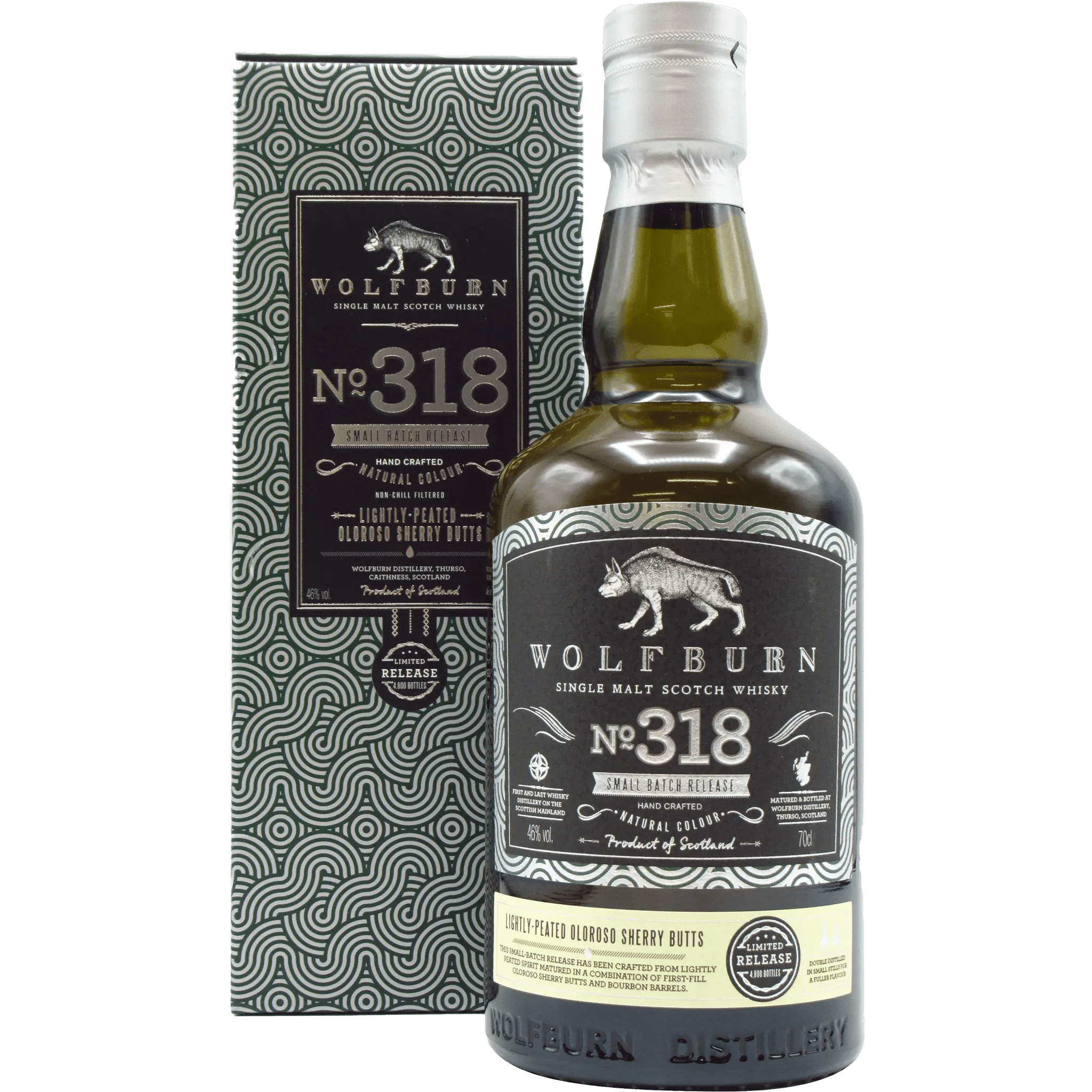 Wolfburn No 318 Small Batch Release is a limited edition single malt Scotch whisky crafted at the Wolfburn Distillery in the far north of Scotland. This expression is produced in small batches using lightly peated spirit matured primarily in Oloroso sherry butts, resulting in a refined balance of gentle smoke, rich fruit, and coastal character.