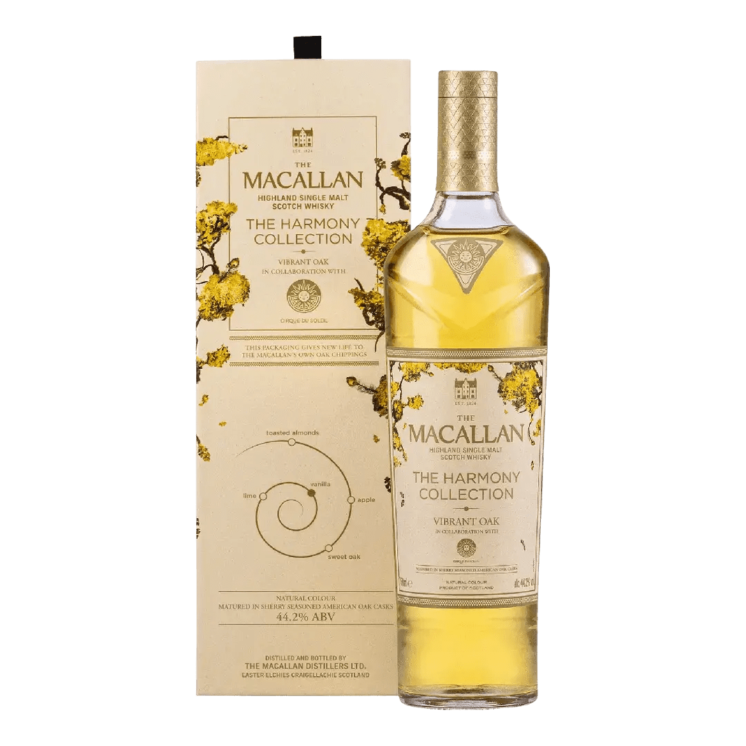 The Macallan Harmony Collection – Vibrant Oak is a limited-edition Highland single malt Scotch whisky created in collaboration with Cirque du Soleil. This expression celebrates the influence of American oak on Macallan’s whisky, drawing inspiration from oak’s vitality, warmth, and natural character.