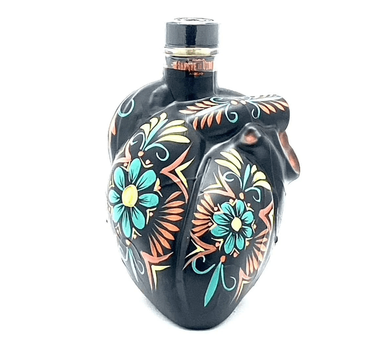 Hand-Painted bottle Inspired by Lotería card number 27, El Corazón, this special edition offering of Sangre de Vida Anejo is presented in a hand-painted, glass heart bottle.